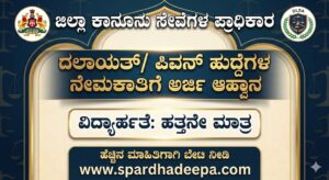 ಜಿಲ್ಲಾ ಕಾನೂನು ಸೇವೆಗಳ ಪ್ರಾಧಿಕಾರ, ಚಾಮರಾಜನಗರ (District Legal Services Authority – DLSA) ಅಧಿಕೃತವಾಗಿ ನೇಮಕಾತಿ ಅಧಿಸೂಚನೆಯನ್ನು ಹೊರಡಿಸಿದೆ. ಆಸಕ್ತ ಮತ್ತು ಅರ್ಹ ಅಭ್ಯರ್ಥಿಗಳಿಂದ ನಿಗದಿತ ನಮೂನೆಯಲ್ಲಿ ಅರ್ಜಿಗಳನ್ನು ಆಹ್ವಾನಿಸಲಾಗಿದೆ. 10ನೇ ತರಗತಿ ಪಾಸಾದ ಅಭ್ಯರ್ಥಿಗಳಿಗೆ ಇದೊಂದು ಸುವರ್ಣಾವಕಾಶವಾಗಿದ್ದು, ಈ ಹುದ್ದೆಯು ಗುತ್ತಿಗೆ ಆಧಾರದ ಮೇಲೆ (Contract Basis) ಮತ್ತು ತಾತ್ಕಾಲಿಕವಾಗಿರುತ್ತದೆ.