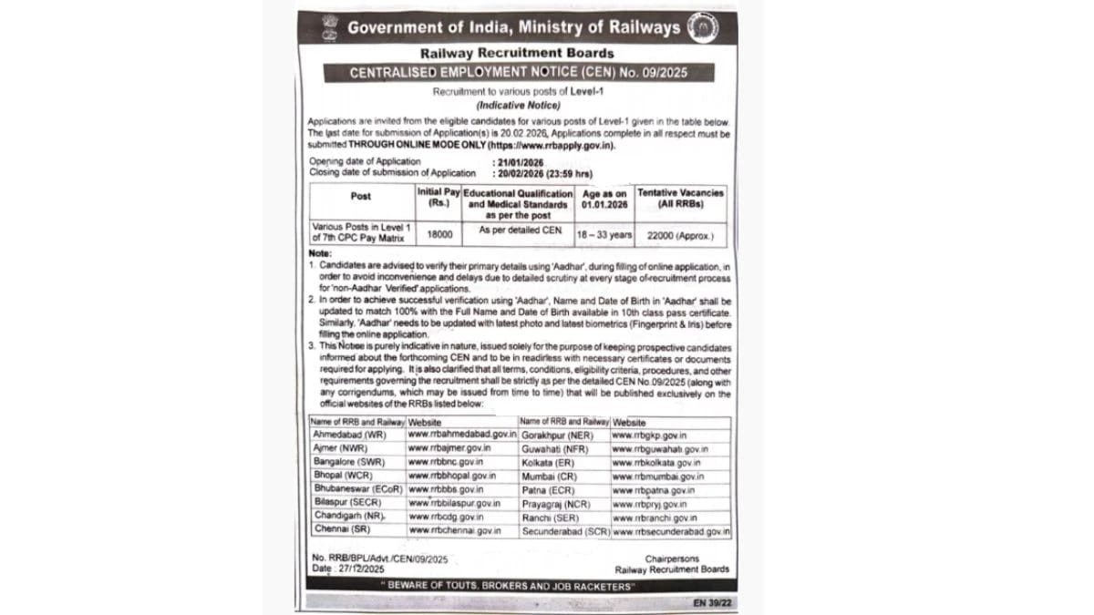 ಭಾರತೀಯ ರೈಲ್ವೆ ಇಲಾಖೆಯಿಂದ ಬೃಹತ್ ನೇಮಕಾತಿ ಅಧಿಸೂಚನೆ ಪ್ರಕಟವಾಗಿದೆ. CEN 09/2025 ಜಾಹಿರಾತು ಸಂಖ್ಯೆಯಲ್ಲಿ ಭಾರತೀಯ ರೈಲ್ವೇ ಇಲಾಖೆಯ ಕರ್ನಾಟಕ ವಿವಿಧ ವಲಯಗಳಲ್ಲಿ ಖಾಲಿ ಇರುವ ಒಟ್ಟು 22000  ಗ್ರೂಪ್‌ ಡಿ (Group D) ಹುದ್ದೆಗಳ ನೇಮಕಾತಿಗೆ ತಿದ್ದುಪಡಿ ನೇಮಕಾತಿ ಅಧಿಸೂಚನೆ ಹೊರಬಿದ್ದಿದೆ. ಮೇಲಿನ ಮಾಹಿತಿಯನ್ನು ನೀಡುವ ಮೊದಲು ಅದರ ನೈಜ್ಯತೆಯನ್ನು ಅಧಿಕೃತ ಮೂಲಗಳಿಂದ ಖಾತ್ರಿ ಪಡಿಸಿಕೊಂಡಿರುತ್ತೇವೆ. ಇಲ್ಲಿ ನೀಡಿರುವ ಎಲ್ಲ ಮಾಹಿತಿಯು ಆಯಾ ಸಂಸ್ಥೆಗಳು ಅಥವಾ ಇಲಾಖೆಯ ಪ್ರಕಟಣೆಯಾಗಿರುತ್ತದೆಯೇ ಹೊರತು ನಮ್ಮ ವೆಬ್ಸೈಟ್ ಯಾವುದೇ ಜವಾಬ್ದಾರಿಯಾಗಿರುವುದಿಲ್ಲ.
